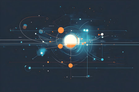 Abstract futuristic interface with glowing lines, circles and data points orbiting around a central sphere, symbolizing technology