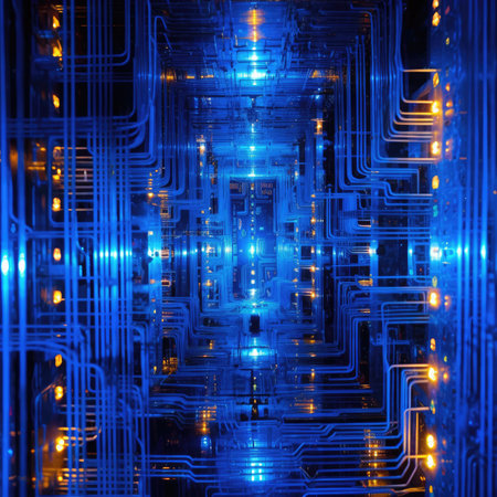 A detailed view of a computer board showcasing numerous red and black parts, An information technology-themed mandala depicting motifs of computer hardware, AI Generated