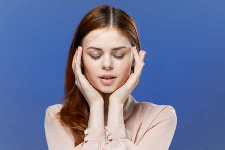 pretty woman holds hand near face cosmetics closeup cosmetology