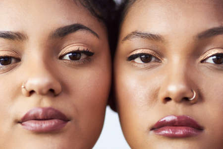 Up close and gorgeous. Studio shot of two beautiful young women posing against a grey background.