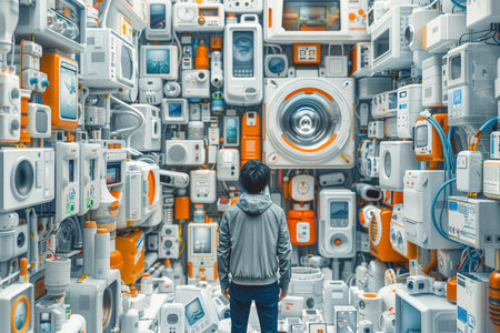 A person standing amidst a collection of vintage electronic devices, symbolizing nostalgia, technology, and the evolution of gadgets. Great for retro and tech history themes.