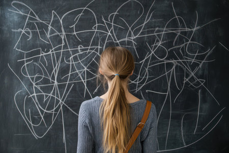 Rear view of a student looking at chaotic lines on chalkboard, symbolizing uncertainty about future education or job decisions.