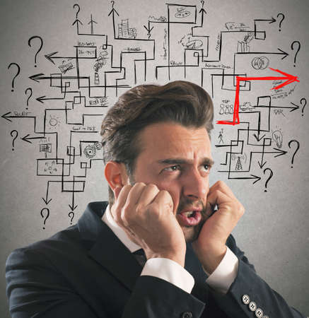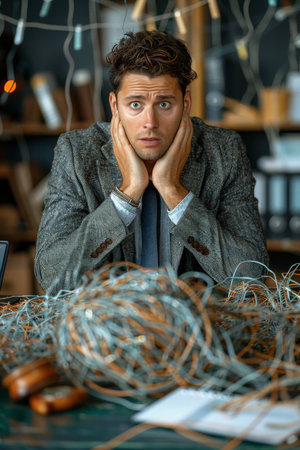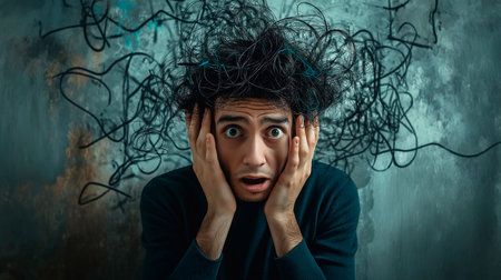A businessman battling mental chaos, anxiety, and stress while striving for clarity and focus.