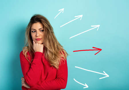 Confused woman have to choose the right arrow to follow. Concept of options, confusion, decision.