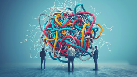 Three businessmen observing a giant tangled ball of yarn, representing the complexity of business problems