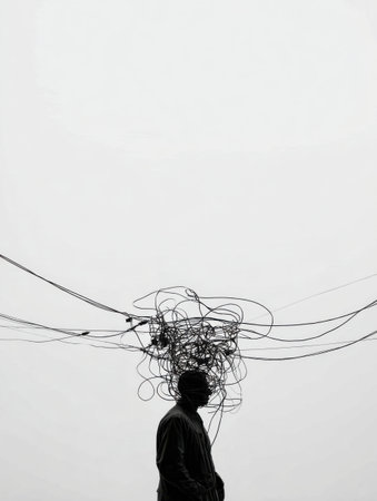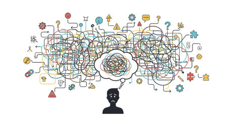 Illustration of a persons head with a chaotic thought bubble. Tangled lines connect to icons representing confusion, ideas, and problem solving in a complex mental process.
