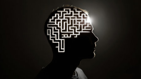 A human silhouette reveals a maze within the head, symbolizing mental confusion, illuminated from above, highlighting inner struggles.