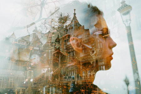 Double exposure of a womans profile and a detailed cityscape, evoking a dreamlike urban vision