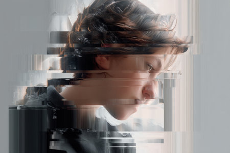 A creative portrait blending art and digital imagery, capturing emotions and stories within a fragmented visual narrative.