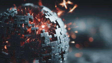 A captivating image of a puzzle sphere surrounded by dynamic sparks, evoking themes of complexity and global connectivity set against a dark backdrop.