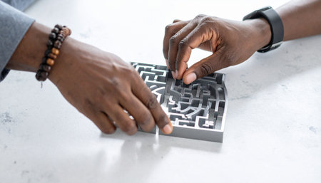 Two colleagues focus intently, their hands working in unison to navigate a complex maze.
