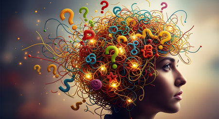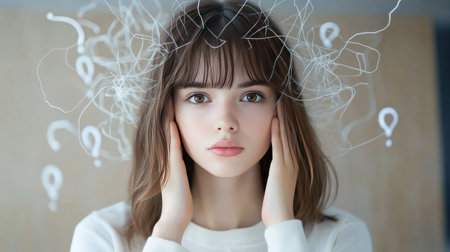 A young woman with a pensive expression, holding her head, surrounded by question marks and tangled lines, symbolizing confusion, stress, and overthinking.