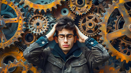 Closeup portrait of a young man in glasses eyes closed hands on his head surrounded by cogwheels and machinery symbolizing deep the process of generating new ideas and solutions
