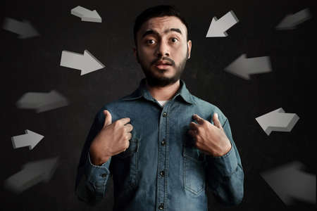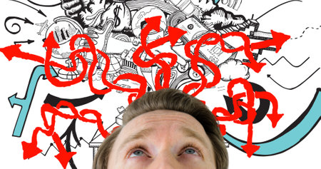 Digital composite of man looking at scattered red arrow symbols over various objects. creativity, confusion and decisions.