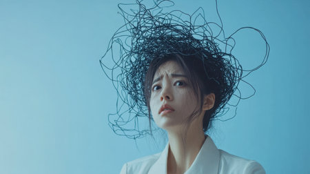 This captivating portrait features a woman with an abstract hairstyle against a blue backdrop, showcasing unique fashion creativity and emotional expression.