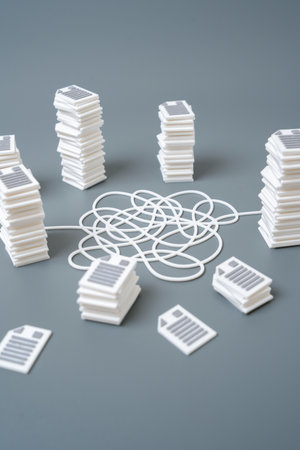 A tangled line in a circle of stacks of papers and documents. Paperwork overload, delays, inefficiency, workflow optimization, solving formalities