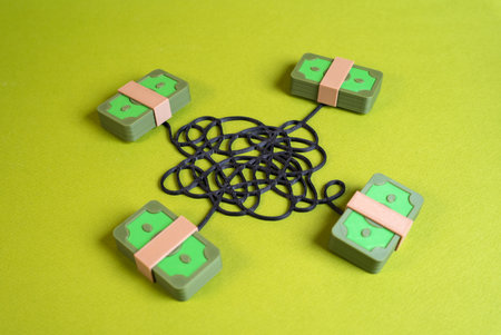 Money connected by tangled lines. Financial crime, corruption. Money laundering, fraud, banking risks, and compliance control.