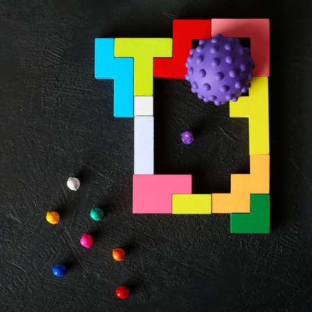 Pieces of different colors on background with place for text. Rainbow colors, abstraction. Educational toys, child development. Study of colors. Labyrinth, connection of elements.