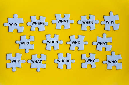 Top view of text on missing jigsaw puzzle - Why, who, what, where and when. Questioning and fact finding concept