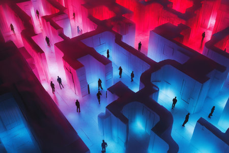 Aerial view of a hyperrealistic abstract labyrinth with people in blue and red gradient lighting