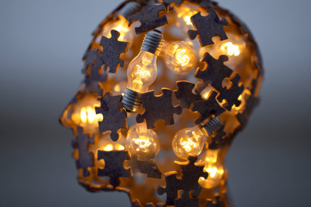 An artistic arrangement of interlocking puzzle fragments forms a human head outline, lit by retro filament lamps symbolizing inspiration and mental activity.
