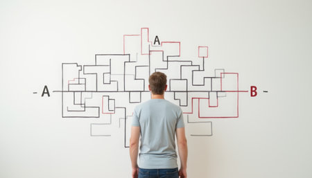 A man stands in front of a wall displaying a complex diagram or flowchart, contemplating a solution or next step.