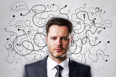 Portrait of attractive young european businessman on concrete wall background with arrows and thought icons sketch. Solution, direction, success and brainstorm concept