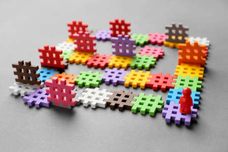 Miniature figure of man looking at cubes with maze pattern. Concept of challenge and problem solving