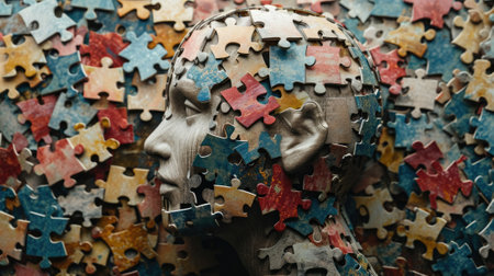 A mosaic arrangement of puzzle pieces forms the shape of a human head with intricate details.