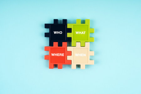 Who, what, where and when text on jigsaw puzzle pieces on blue background