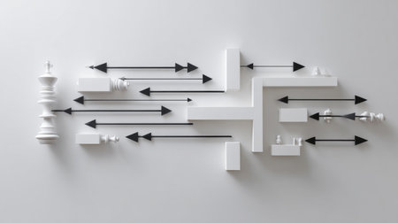This abstract image features chess pieces and arrows in a minimalist design, symbolizing strategy and planning in dynamic decision-making processes.