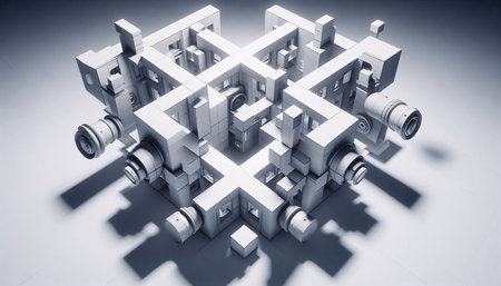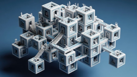 This image showcases an abstract composition featuring multiple interconnected cube-shaped structures. The artwork displays a monochromatic palette with subtle variations in tone. Constructed with intricate details, it suggests an imaginative environment. The design could be suitable for various commercial applications, including illustrations and conceptual designs.