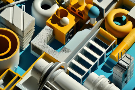 A colorful industrial building with yellow pipes and a pink pipe. The building is a mix of bright colors and the pipes are painted in different shades of pink and yellow. Scene is vibrant and lively