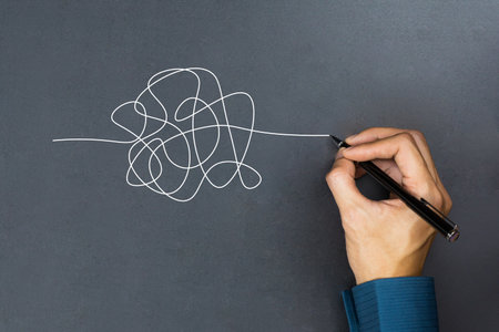 The way to business thinking success concept. A businessman hand drawing a white tangle line on blackboard.