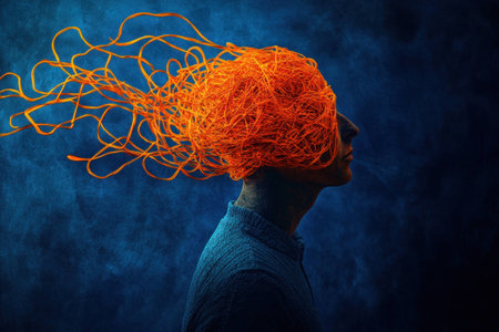An artistic abstract representation of mental chaos, featuring a profile of a person s head with vibrant orange neural patterns against a dark blue background