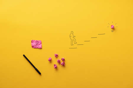 Conceptual image of solution, vision and idea with a silhouette of a man walking up the steps towards a light bulb. Over yellow background.