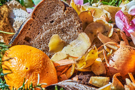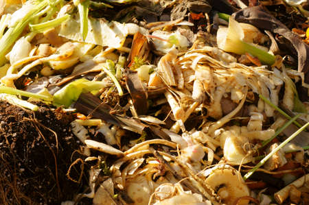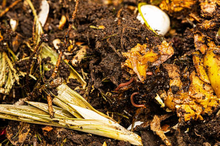 The close-up of a pile of humus in a garden with organic waste from vegetable and fruit bowls.