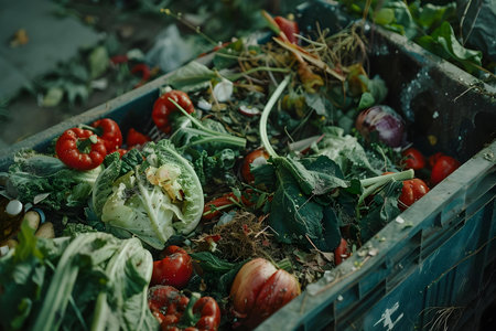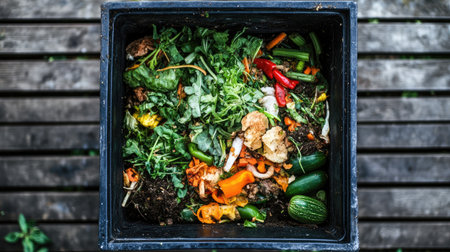 A vibrant compost bin filled with fresh organic food waste, showcasing colorful vegetable scraps and leafy greens in a sunny garden.
