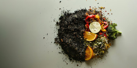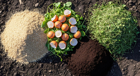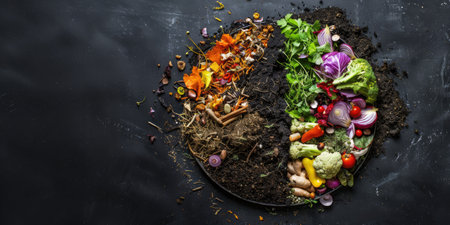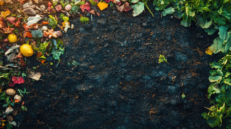 Generative AI, half of food waste compost and half of soil, environmental background, biodegradable kitchen waste, composting organic food