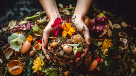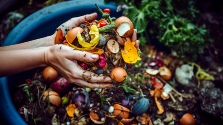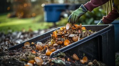 An engaging image suitable for environmental blogs, sustainable living guides, or educational material on waste management | The photograph showcases an individual's hands actively participating in the composting process, symbolizing human interaction with nature's recycling system. Captured with remarkable clarity, the mixture of organic waste—striking in its variety of colors and textures—is being poured from a bucket into a compost bin. The act caught in the frame, highlighted by the dynamic scattering of scraps and soil, conveys the tangible process of turning kitchen waste into nutrient-rich compost. The depth of the image juxtaposes the sharp foreground against the softer, verdant background of a garden, suggesting a continuous cycle from growth to decay and back to enrichment. It also subtly celebrates the personal effort and commitment to environmental stewardship while demonstrating the simple, yet effective method of reducing one's ecological footprint | Ideal for educational content stressing the importance of organic recycling and waste reduction, as an illustrative scene in a documentary about sustainable practices, or as a powerful visual reminder of individual responsibility towards the environment in campaigns promoting green habits. It may also serve as a compelling image for workshops or tutorials about starting a home composting system | a detailed photo of hands tipping biodegradable waste into a compost container amidst a garden environment, capturing a fluid motion and the contrasts in organic matter's color and texture under natural daylight