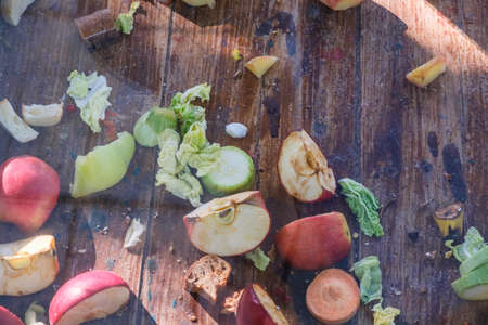 Various vegetable scraps were scattered on the soil. Gardening and planting concept.