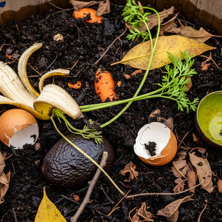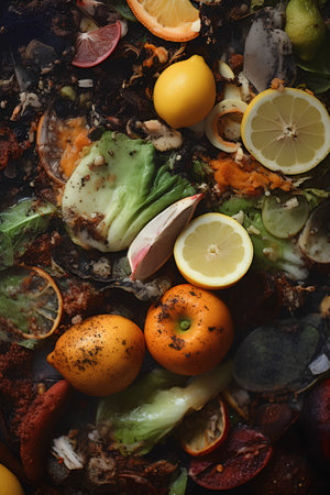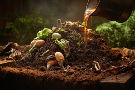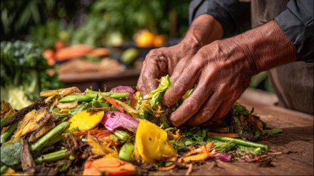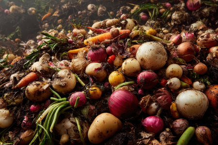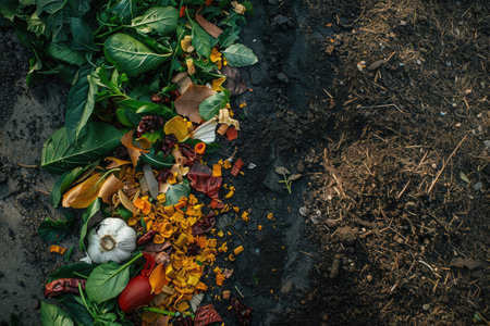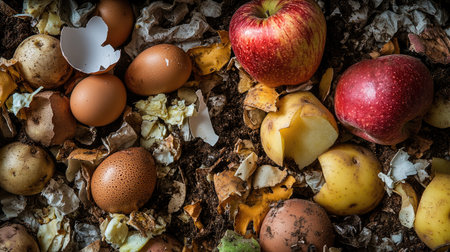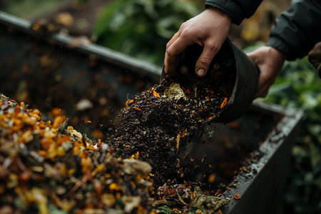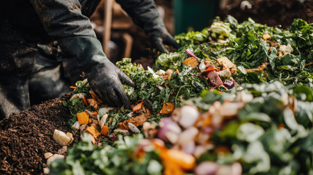 Close-up of composting process with food scraps and yard waste being mixed and decomposing into high-quality compost, showcasing effective waste management