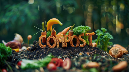 Generative AI, word Compost made of food waste compost and soil, environmental background, biodegradable kitchen waste, composting organic food