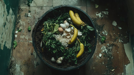 Top view of a compost bin brimming with bio trash like eggshells, banana peels, and wilted greens, against a kitchen floor.