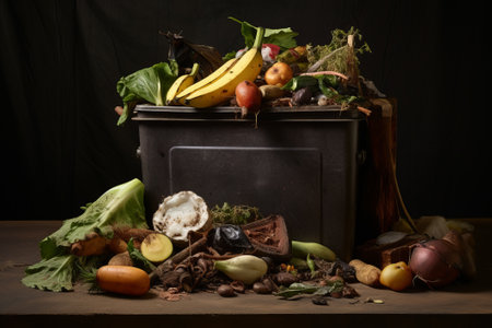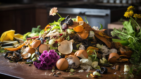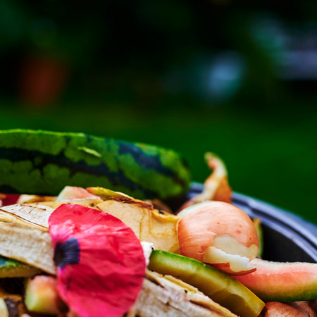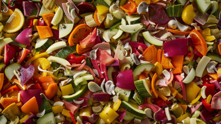 A compost bin filled with colorful food scraps and vegetable peels, promoting eco conscious living and sustainability