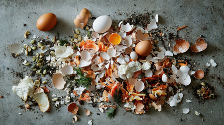 Various food scraps like eggshells, vegetable waste, and seeds piled on a gray surface, highlighting sustainable composting practices for a greener future.