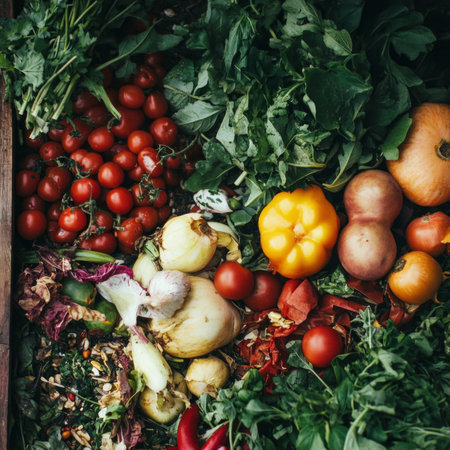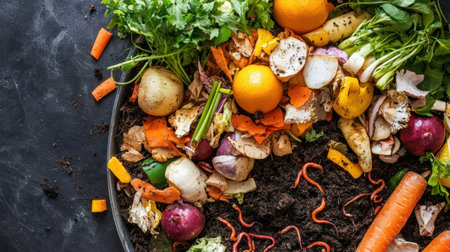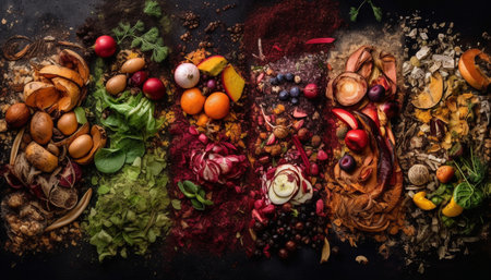 Colorful organic kitchen waste arranged on a dark surface. Fresh vegetable scraps, peels, and herbs symbolize sustainability and eco-friendly practices for composting.