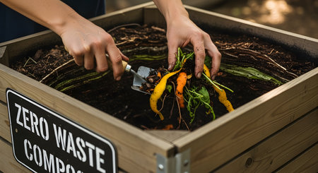 A person uses a garden trowel to mix fresh vegetable scraps into a wooden compost bin filled with dark soil. A sign in the foreground reads 'Zero Waste Compost,' highlighting the eco-friendly activity of recycling organic matter. The image promotes sustainability, gardening, and responsible waste management.