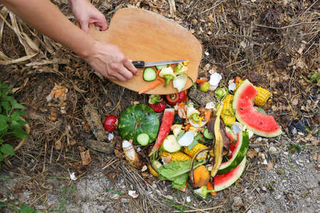 Person who put in a composter some kitchen waste like vegetables, fruits, eggshell, coffee grounds in order to sort and make bio fertilizer
