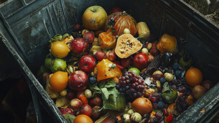 A vivid display of discarded fruits and vegetables in a trash bin, illustrating food waste and its impact on urban environments and sustainability efforts.